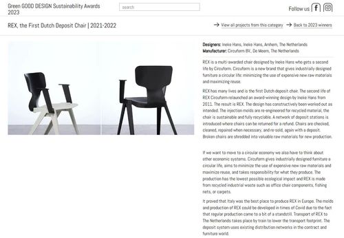 REX ist der erste niederländische Pfandstuhl und setzt ein Beispiel für die Branche, indem er nicht nur den Vertrieb an die Nutzer, sondern auch den Vertrieb von den Nutzern organisiert. Auf diese Weise kümmert sich Circuform um seine gebrauchten Materialien und garantiert die Wiederverwendung und das Recycling der Materialien. REX möchte den Nutzern auch bewusst machen, was, wie und wo sie Möbel und Waren verwenden.
